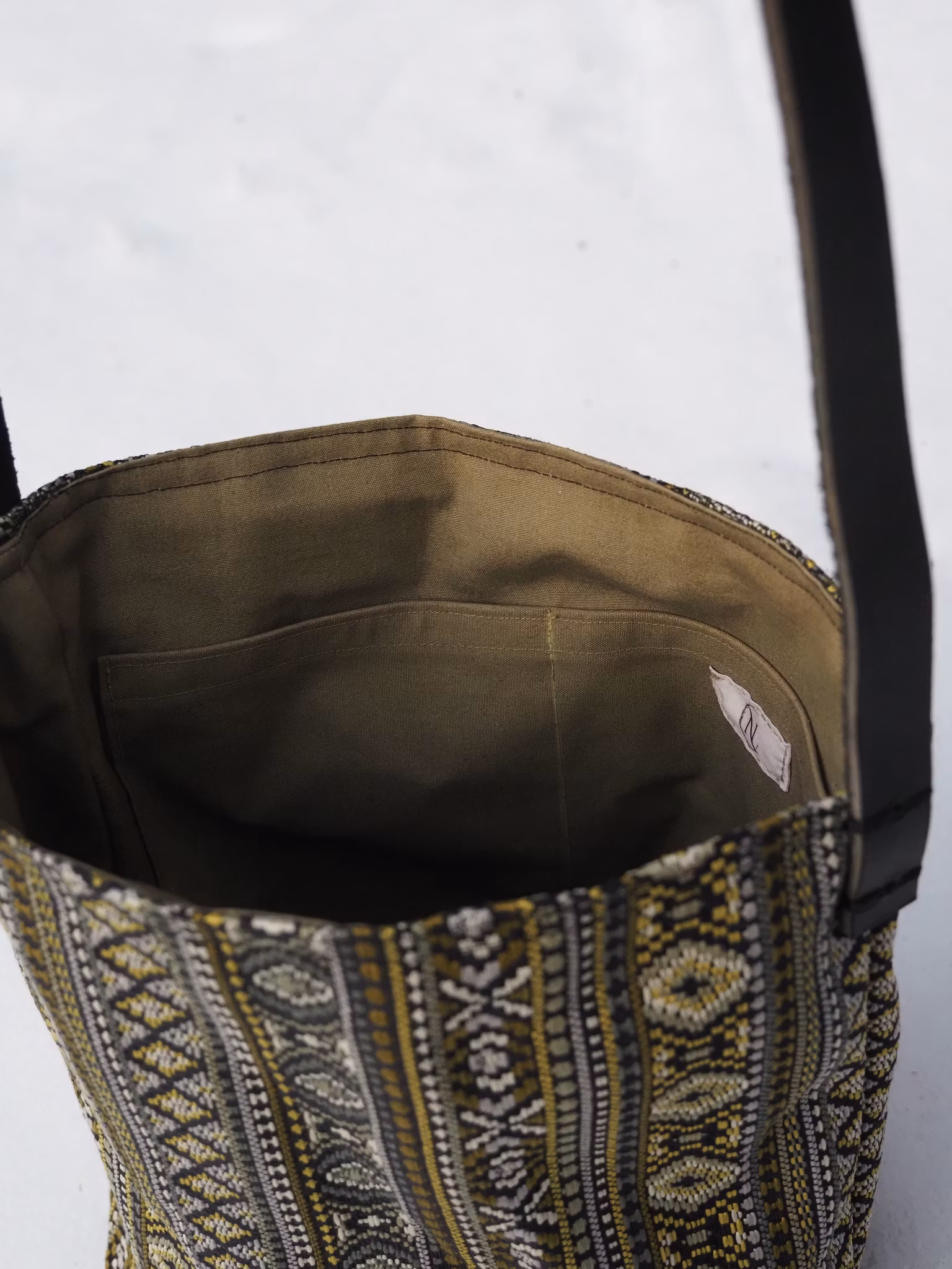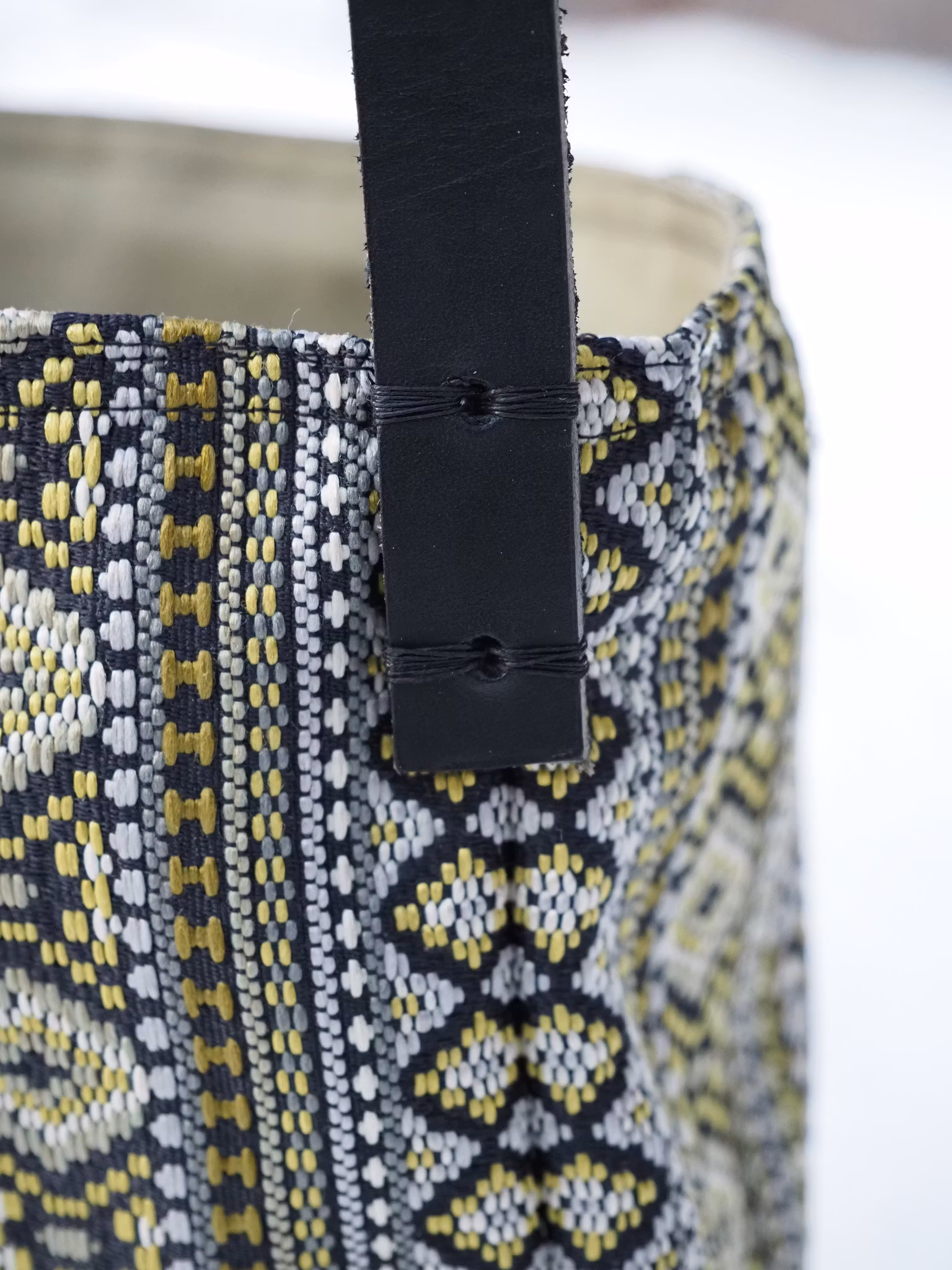 Axelremsväska tillverkad av ett snyggt och slitstarkt möbeltyg från en tysk fabriksoutlet. Fodrad med bomullscanvas som ger väskan stadga. Två väl tilltagna innerfickor med plats för exempelvis större mobiltelefon och plånbok. Axelremmen är en läderrem av naturgarvat läder från ett nedlagt sadelmakeri.